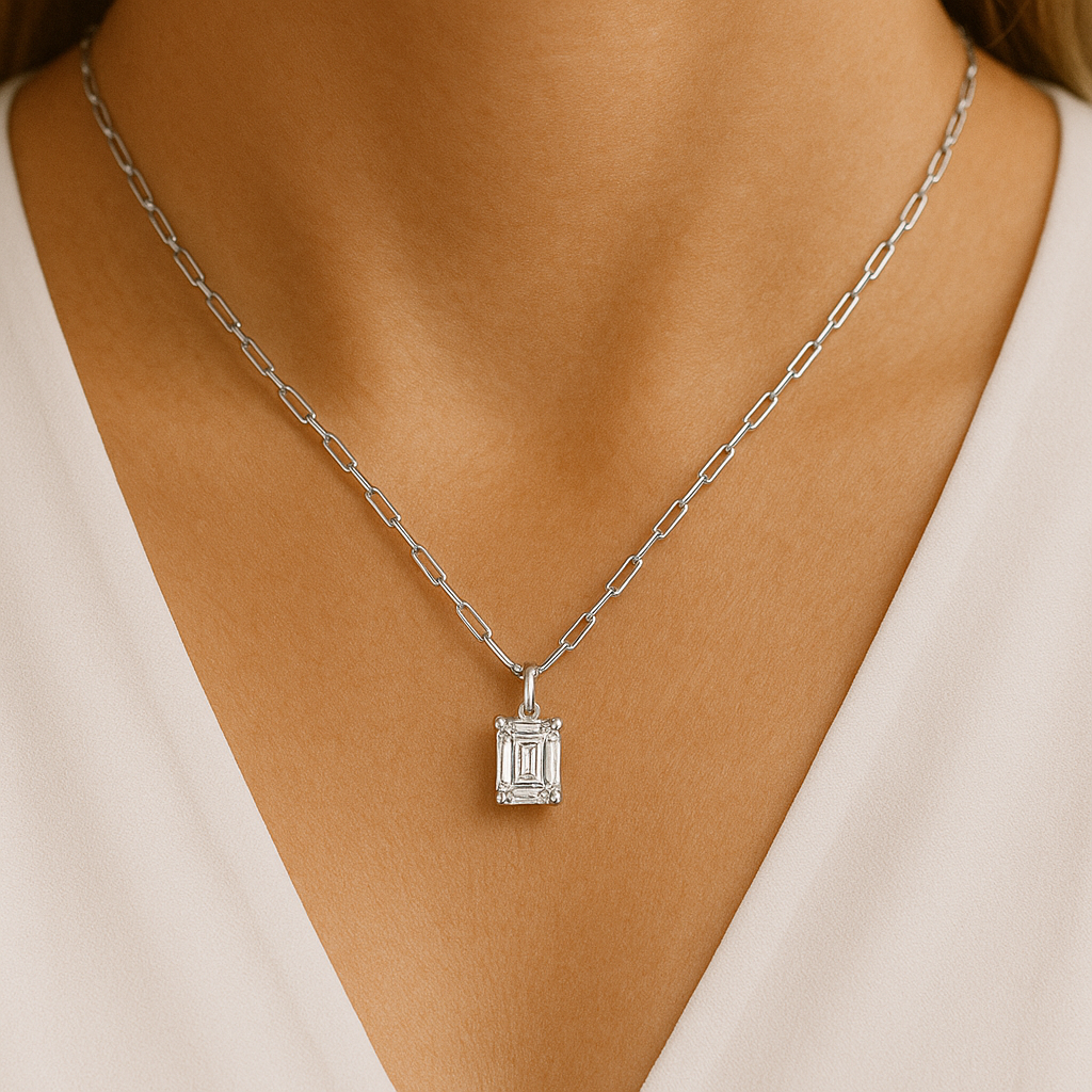 The stone rests on a fine sterling silver chain — subtle yet striking, made to layer or stand alone. this 1ct emerald-cut necklace is made for women who want everyday elegance with fine-jewelry quality.