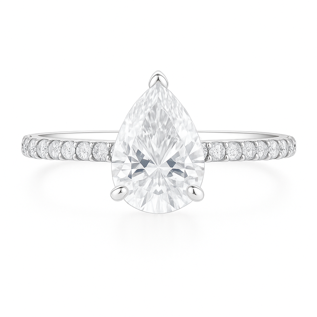 - Main Stone: 1.5 or 3ct Pear Cut lab-grown diamond